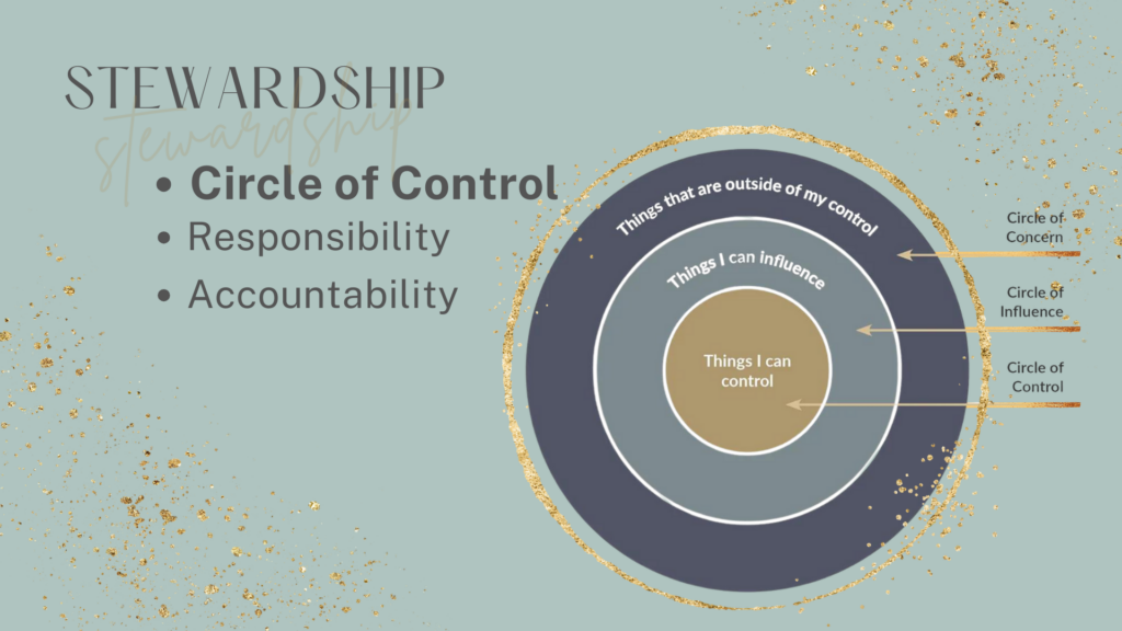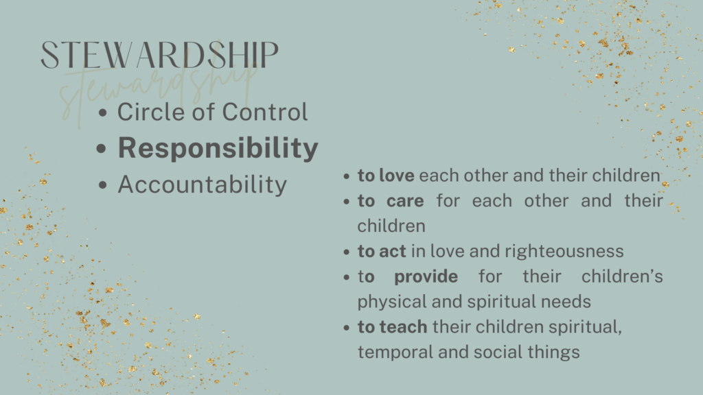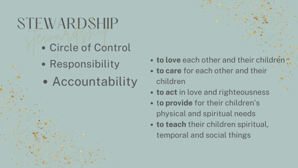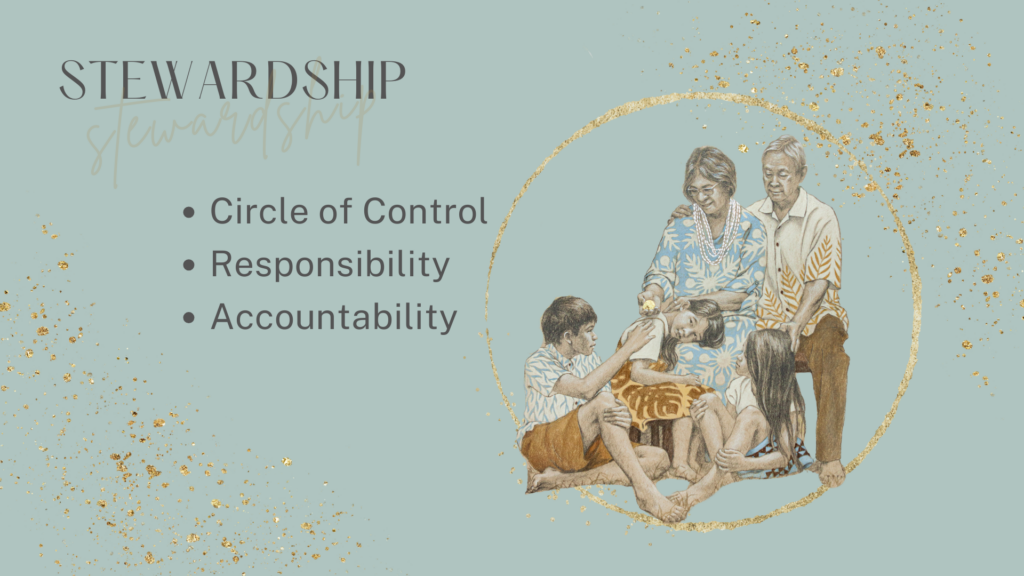 Stewardship is ‘the job of supervising or taking care of something.’ In the church, stewardship involves recognizing that our responsibilities and relationships are given to us by our Heavenly Father. Three key elements of stewardship are ‘circle of control’, responsibility, and accountability.