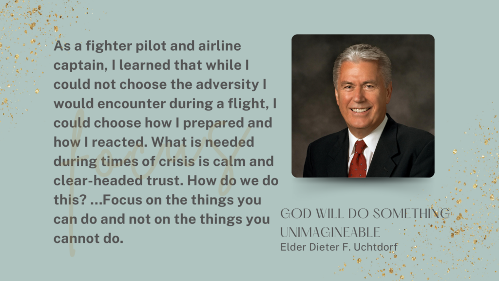 “As a fighter pilot and airline captain, I learned that while I could not choose the adversity I would encounter during a flight, I could choose how I prepared and how I reacted. What is needed during times of crisis is calm and clear-headed trust. How do we do this? …Focus on the things you can do and not on the things you cannot do.”² (emphasis mine)