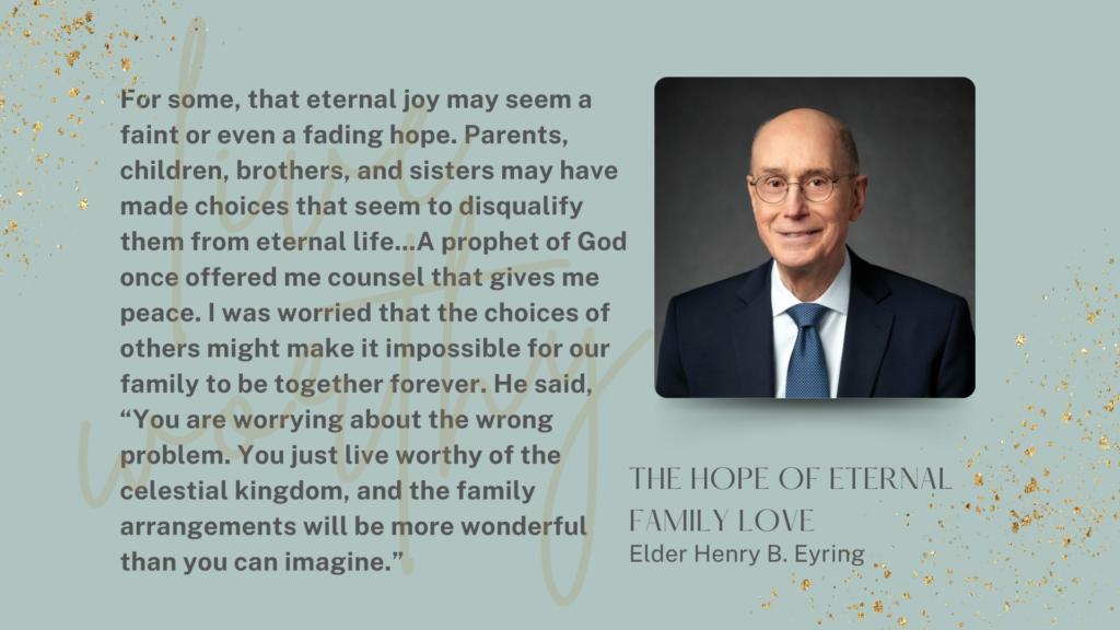 “For some, that eternal joy may seem a faint or even a fading hope. Parents, children, brothers, and sisters may have made choices that seem to disqualify them from eternal life…A prophet of God once offered me counsel that gives me peace. I was worried that the choices of others might make it impossible for our family to be together forever. He said, “You are worrying about the wrong problem. You just live worthy of the celestial kingdom, and the family arrangements will be more wonderful than you can imagine.”³