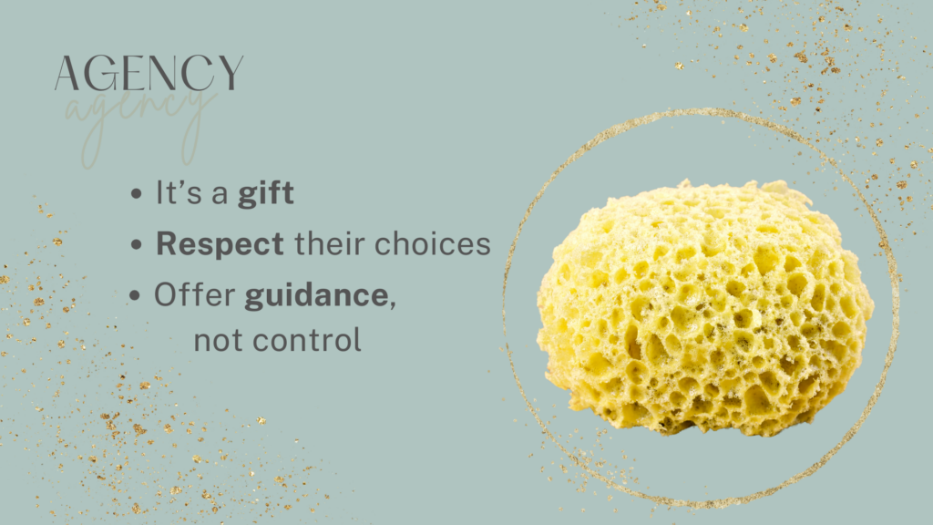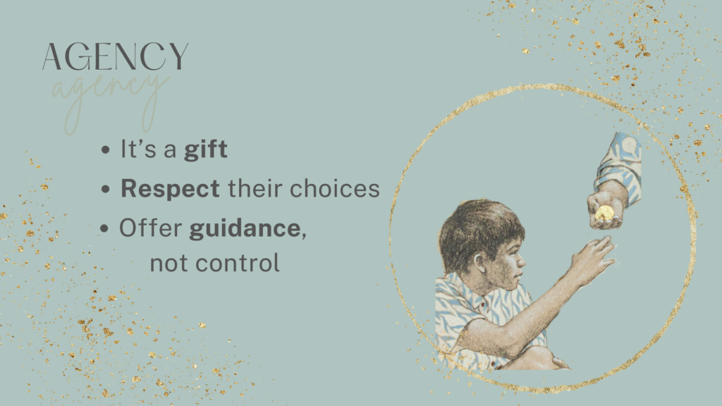 Agency is a divine gift given to all of God’s children. It allows us to make choices and be accountable for those choices, which is a necessary condition for personal and spiritual growth. This allows us to learn from our experiences, develop faith, and grow spiritually. Without agency, the concept of sin, repentance, and forgiveness would be meaningless. Both we as parents and our children have agency. As parents, it’s so important for us to recognize the agency of our children. We can do this by respecting their choices, encouraging personal growth and offering guidance, not control.