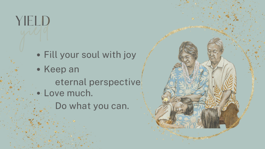 “Y” stands for Yield. Yielding our hearts to God is the process of becoming truly converted and sanctified. It has to do with keeping an eternal perspective that focuses on hope and faith, not fear. When we yield, we love much and do what we can.