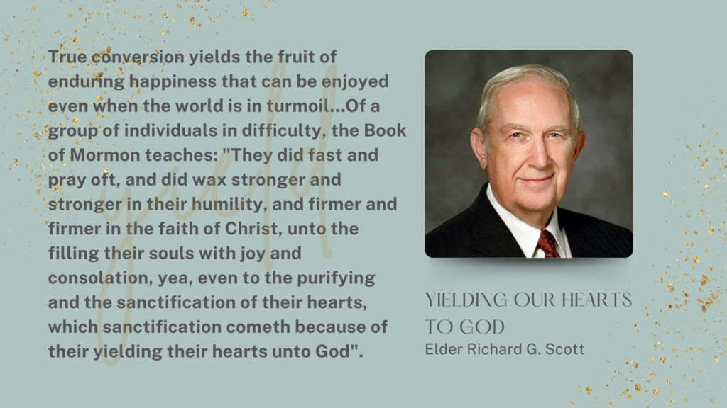 True conversion yields the fruit of enduring happiness that can be enjoyed even when the world is in turmoil…Of a group of individuals in difficulty, the Book of Mormon teaches: “They did fast and pray oft, and did wax stronger and stronger in their humility, and firmer and firmer in the faith of Christ, unto the filling their souls with joy and consolation, yea, even to the purifying and the sanctification of their hearts, which sanctification cometh because of their yielding their hearts unto God”.