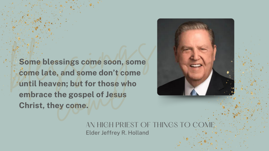 Elder Jeffrey R. Holland encouraged us to remember this fact when he said, “Some blessings come soon, some come late, and some don’t come until heaven; but for those who embrace the gospel of Jesus Christ, they come.”