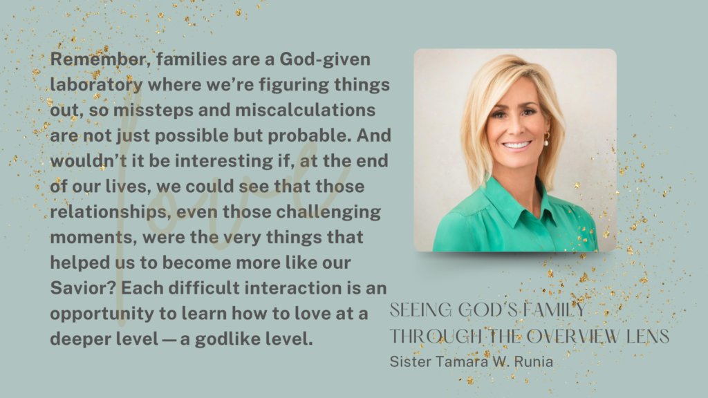 “Remember, families are a God-given laboratory where we’re figuring things out, so missteps and miscalculations are not just possible but probable. And wouldn’t it be interesting if, at the end of our lives, we could see that those relationships, even those challenging moments, were the very things that helped us to become more like our Savior? Each difficult interaction is an opportunity to learn how to love at a deeper level—a godlike level.”