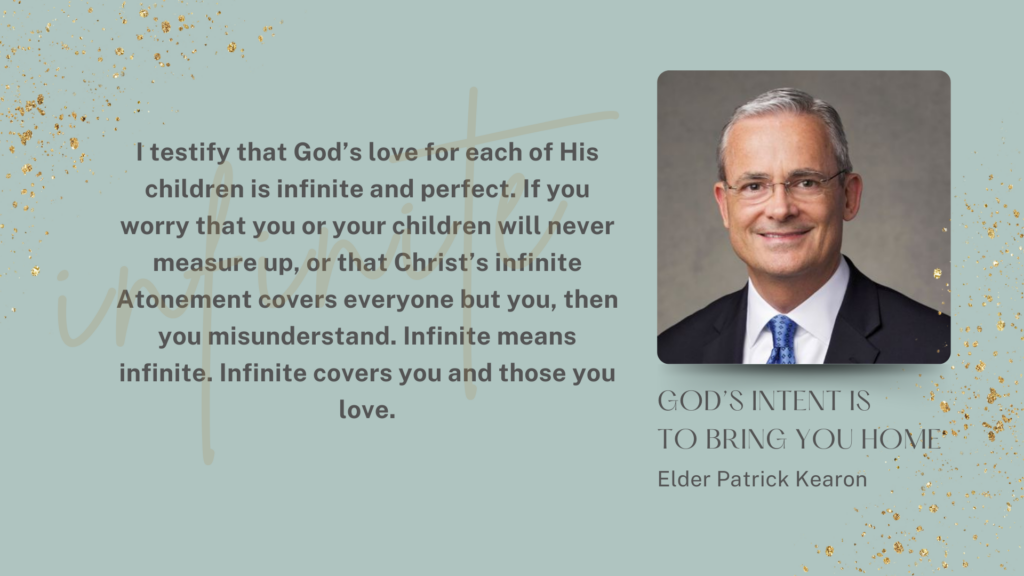 “I testify that God’s love for each of His children is infinite and perfect. If you worry that you or your children will never measure up, or that Christ’s infinite Atonement covers everyone but you, then you misunderstand. Infinite means infinite. Infinite covers you and those you love.”