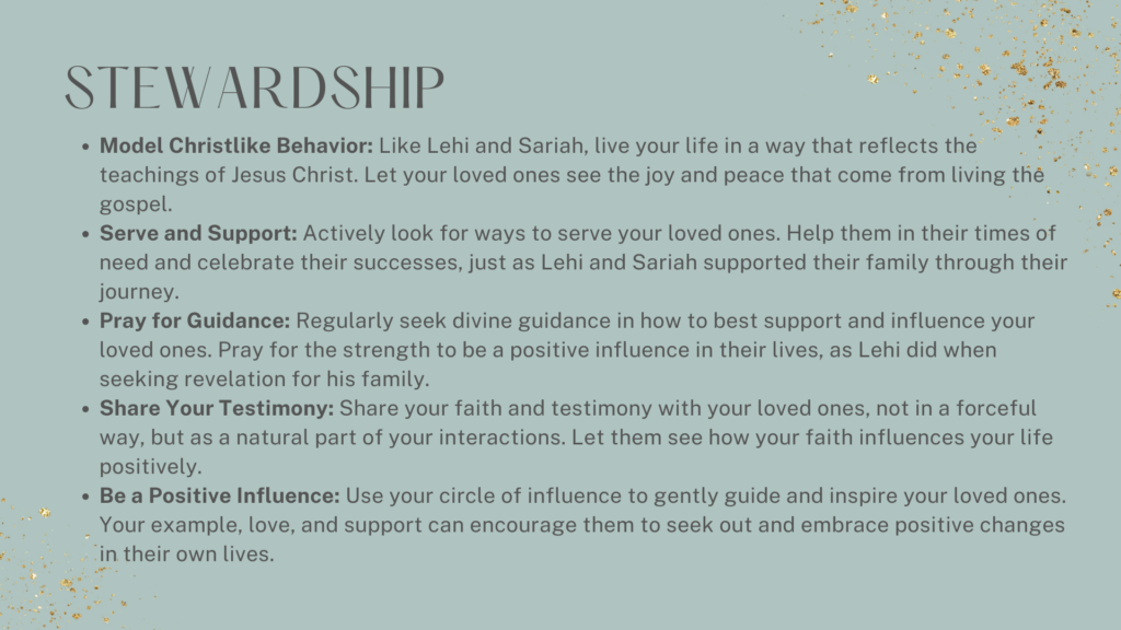 - Pray for Guidance: Regularly seek divine guidance in how to best support and influence your loved ones. Pray for the strength to be a positive influence in their lives, as Lehi did when seeking revelation for his family.