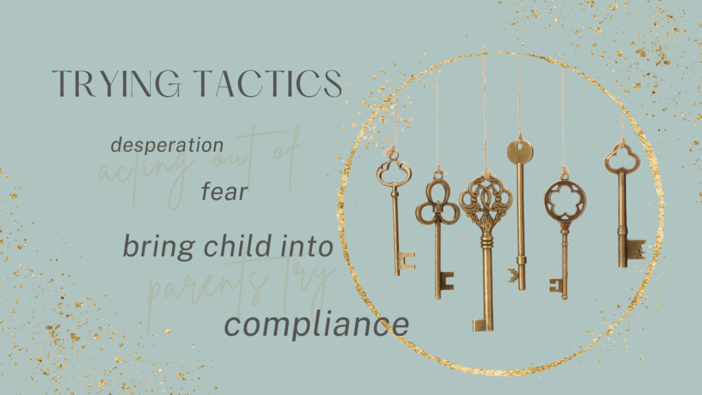Faced with these difficult emotions, it’s easy to act out of desperation or fear. Parents try different tactics to bring that child into compliance, much like trying every key on the ring trying to find the one that will open the door. Common tactics include (but aren’t limited to)