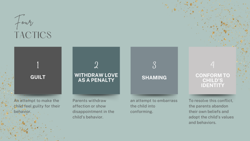 - Conforming to the Child’s Identity: This happens when a parent feels conflicted because their beliefs differ from their child’s behavior. To resolve this conflict, the parent abandons their own beliefs and adopts the child’s values and behaviors, both privately and publicly.
