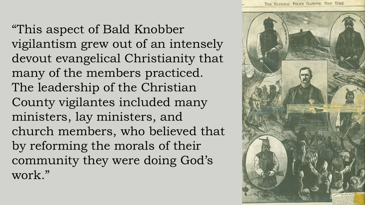 These religious leaders were not alone in their extralegal punishment of real and perceived miscreants. An 1857 eastern Iowa vigilance movement was presided over by a Rev. Ewald Cooly, with Rev. A. McDonald serving as the treasurer. Additionally, two ministers were among Socorro, New Mexico’s vigilantes.¹⁷