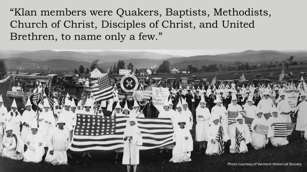 Like their nineteenth-century counterparts, Klan members of the 19teens and 1920s, “embraced Protestant Christianity and a crusade to save America from domestic as well as foreign threats.” Twentieth-century “Klan members were Quakers, Baptists, Methodists, Church of Christ, Disciples of Christ, and United Brethren, to name only a few.”²⁰