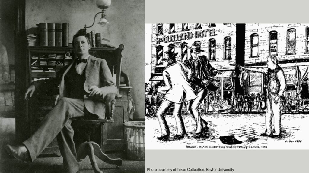 Just four days later, Brann took another thrashing, this time at the hands of Baylor trustee Judge John Scarborough and his son, George. The Scarboroughs were enraged at Brann’s “Magdalenes” remark, as the elder Scarborough’s daughter was then a Baylor alumna and English instructor. While the son held Brann at gunpoint, the father laid into him with a cane. One of the student ringleaders of the previous incident happened by right then and joined in the fun, lashing Brann with his horsewhip, shouting, “So you wouldn’t leave town, eh?“³⁴