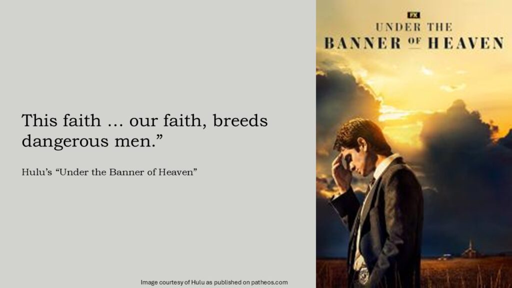 A character in the Hulu series Under the Banner of Heaven dramatically proclaimed, “This faith, our faith, breeds dangerous men.”¹ And Jon Krakauer referred to Mormonism as a violent faith.²