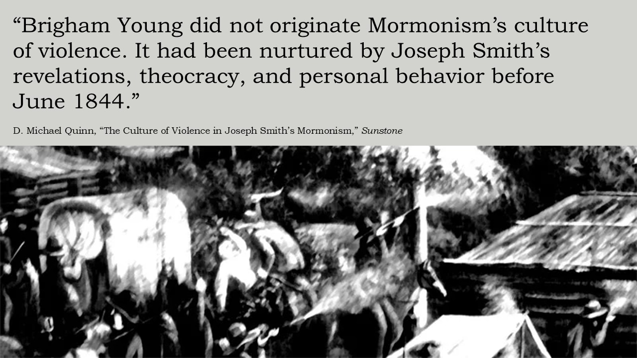 Brigham Young did not originate Mormonism’s culture of violence. It had been nurtured by Joseph Smith’s revelations, theocracy, and personal behavior before June 1844.”