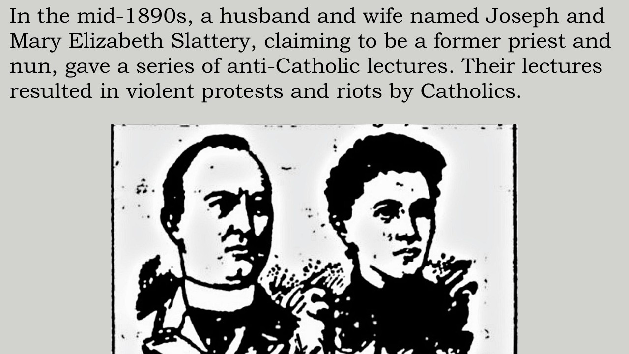 74“Ex-Priest Slattery,” The Wichita Daily Eagle, October 28, 1893, 1. According to Jonathan Smyth, “The Slatterys: An ex-priest and a ‘bogus’ nun,” The Anglo-Celt, September 12, 2021, https://www.anglocelt.ie/2021/09/12/the slatterys-an-ex-priest-and-a-bogus-nun/, accessed July 17, 2024, Joseph Slattery appears to have studied to be a