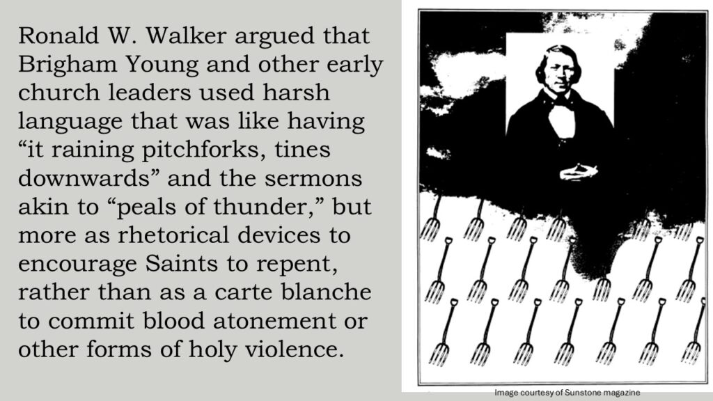 93 Paul H. Peterson, “The Mormon Reformation of 1856-1857: The Rhetoric and the Reality,” Journal of Mormon History 15, no. 1 (1989), 84 n. 69 and Ronald W. Walker, “Raining Pitchforks: Brigham Young as Preacher,” Sunstone 8 (May/June 1983), 7. Walker’s article, page 5-9 of that issue of Sunstone is excellent for better understanding Brigham Young’s style and purpose of preaching and helps put the Mormon Reformation and teachings of blood atonement in historical context.