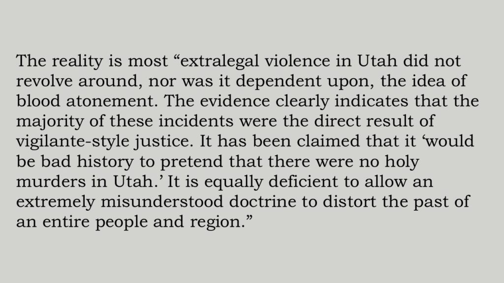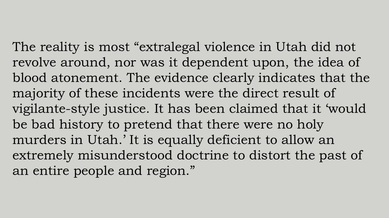 To pretend that there were no holy murders in Utah and along the trails to California, that there was no saving of the souls of sinners by the shedding of their blood during the blood atonement revival of 1856, that there were no mysterious disappearances of apostates and offensive Gentiles, is simply bad history.”³