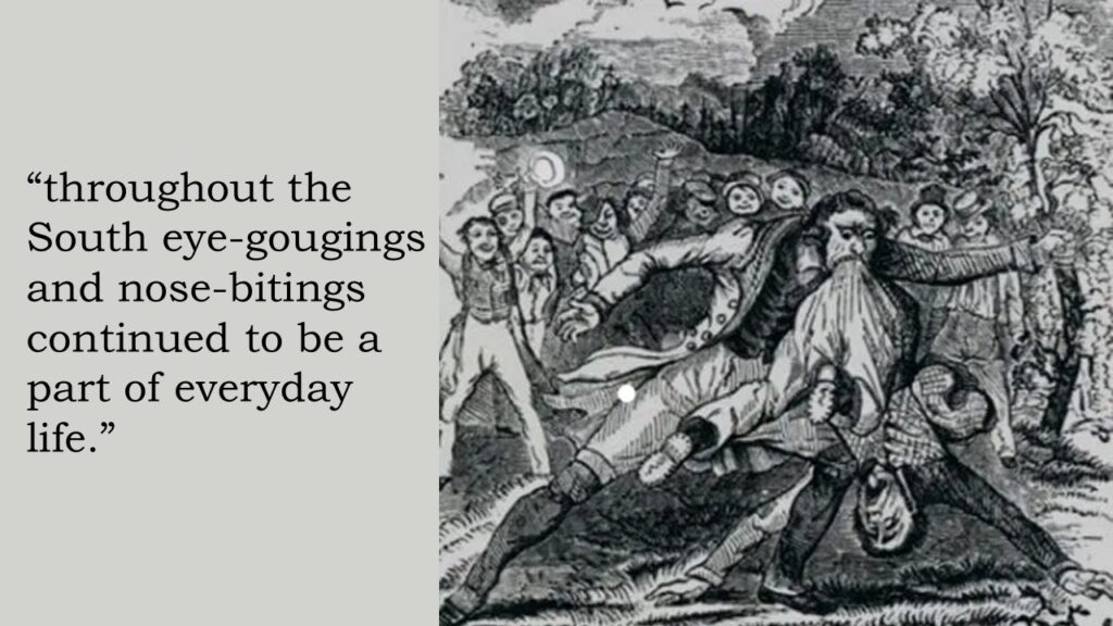 The Great Awakening’s attempt to reform the violent habits of men was significant, but throughout the South eye-gougings and nose-bitings continued to be a part of everyday life.”