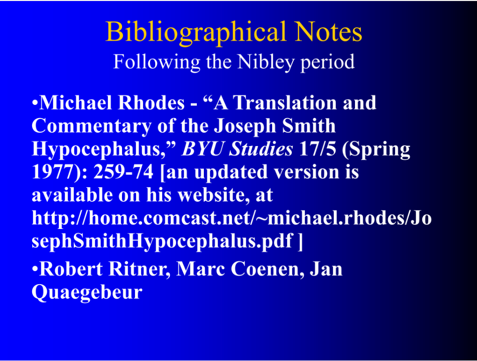 Michael Rhodes published a translation and commentary on Facsimile 2—remember that we call that the hypocephalus—in BYU Studies, and he keeps updating it and puts it on his website.