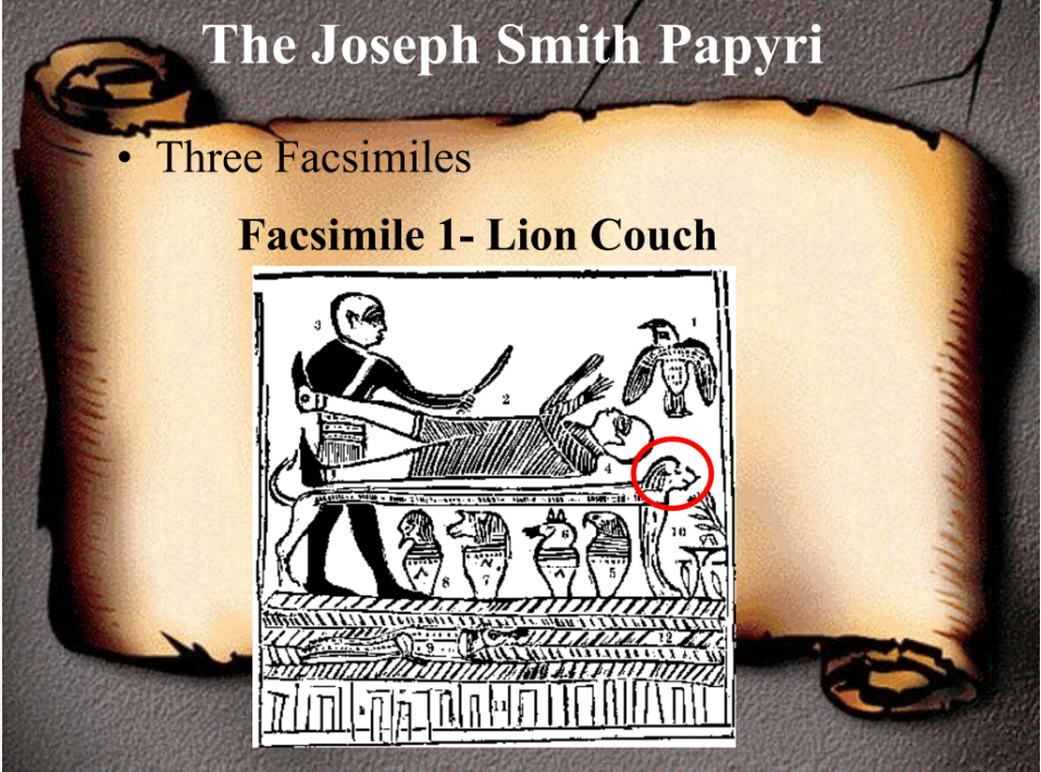 Facsimile 1 we often refer to as a “lion couch scene” because this bier or altar or whatever it is the figure is lying on is—as you can see—in the shape of a lion.