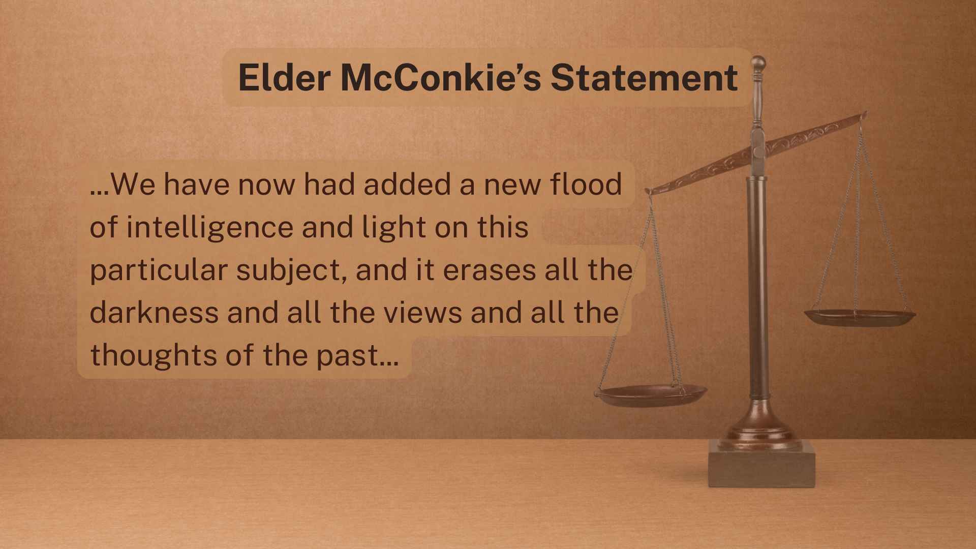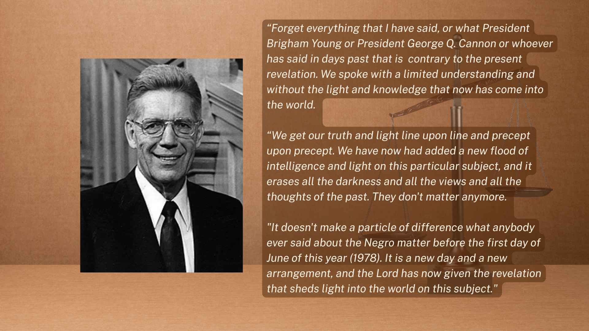 “Forget everything that I’ve said or what President Brigham Young or President George Q. Cannon or whoever has said in the days past that is contrary to today’s revelation. We spoke with a limited understanding and without the light and knowledge that is now coming to the world. We get our light and truth line upon line, precept upon precept. And we have now had added a new flood of intelligence and light on this particular subject, and it erases all of the darkness and all of the views and all of the thoughts of the past. They just don’t matter anymore.”