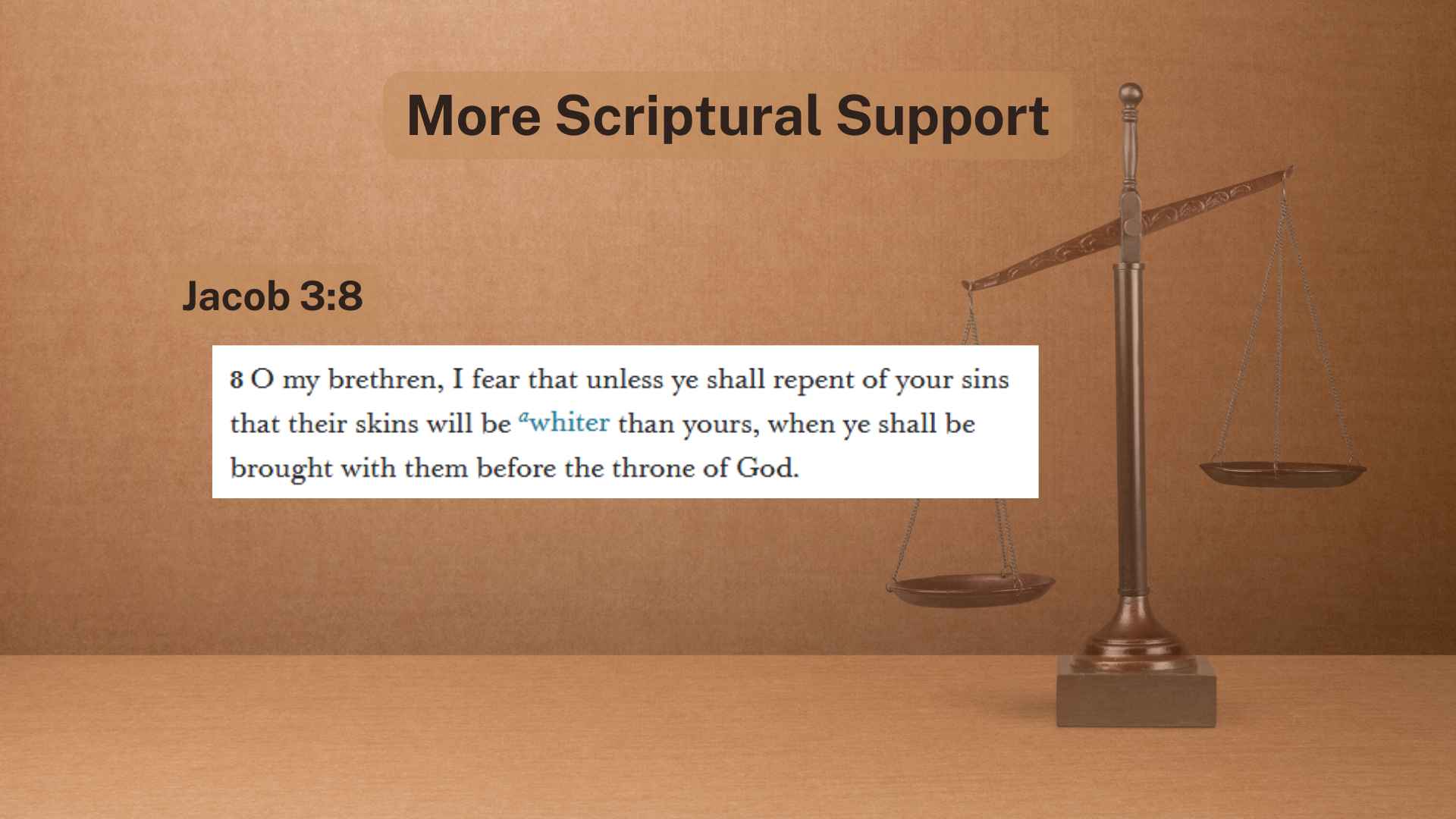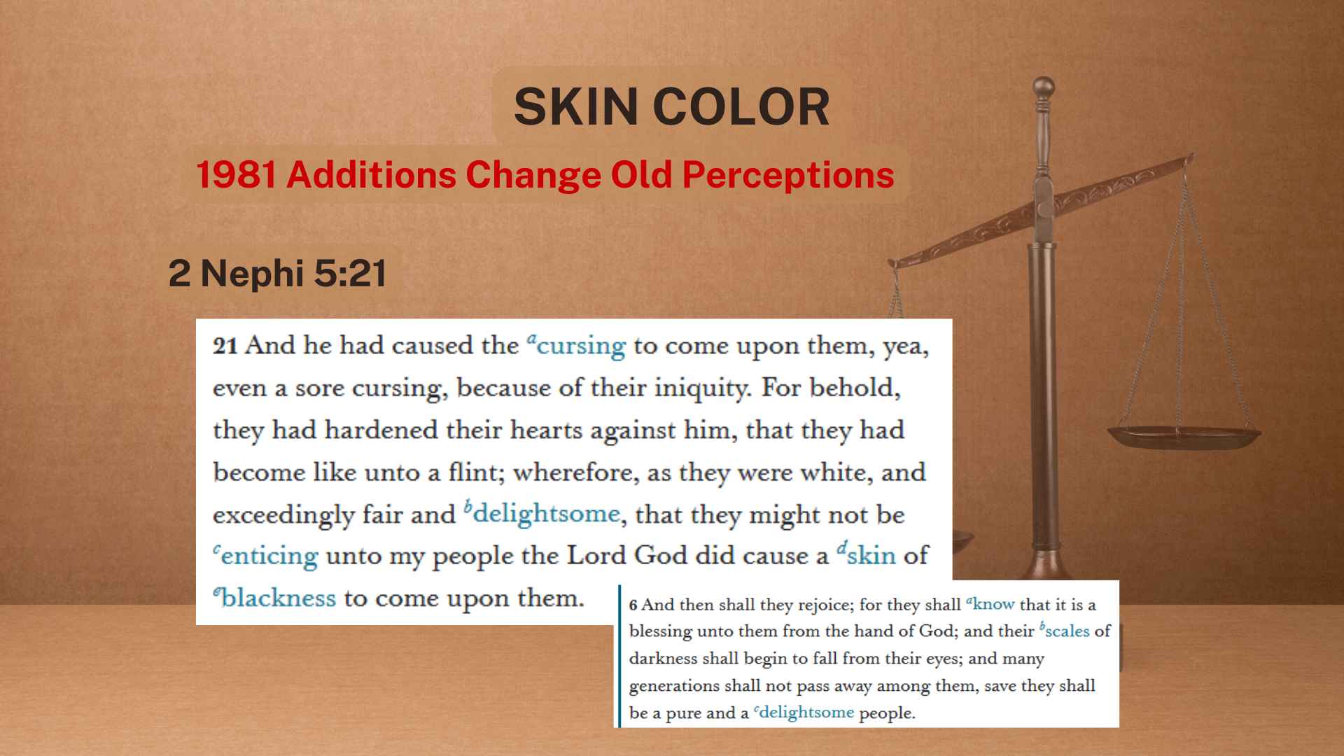 All right. So, let’s get a little more scriptural support. Now, every scripture in the Book of Mormon that made you think that the Lamanites had a darker skin than the Nephites, it actually has a new footnote on it.