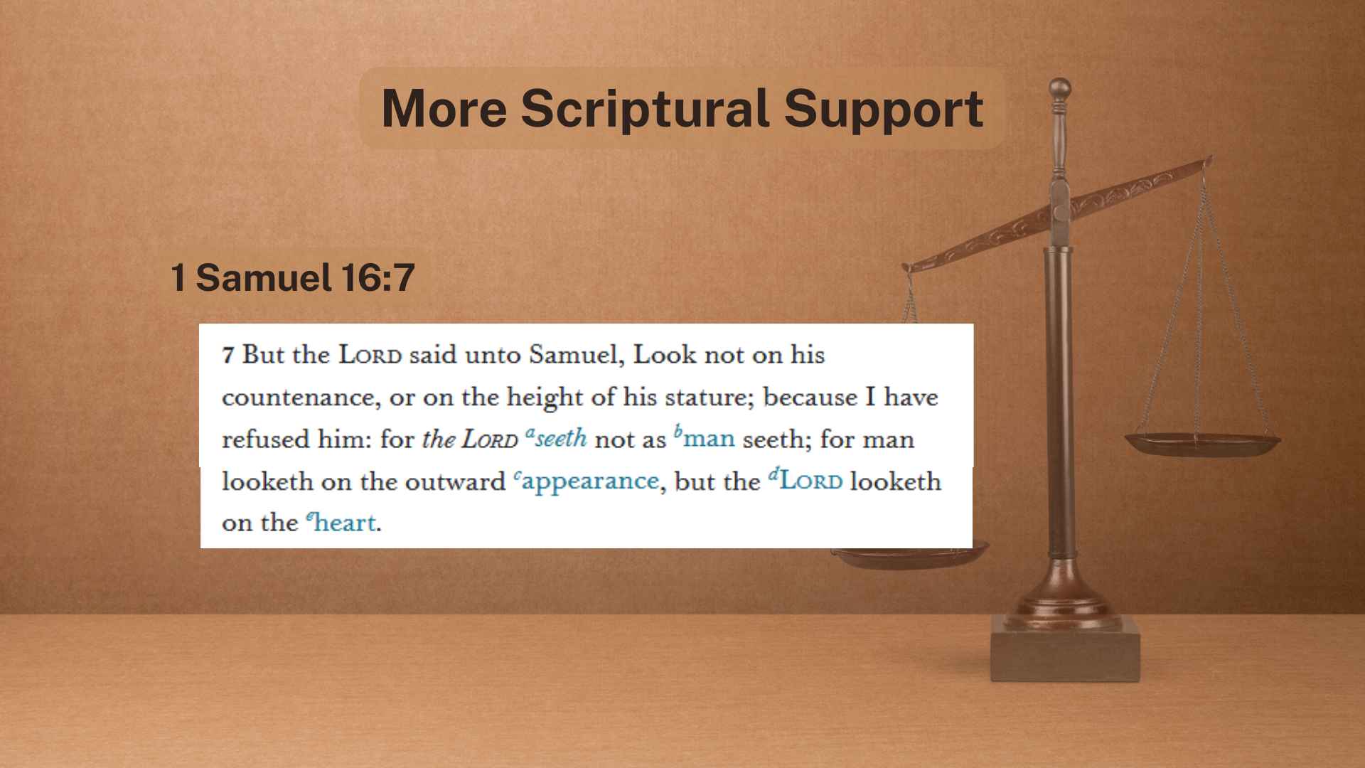 “But the Lord said unto Samuel, Look not unto his countenance, or the height of his stature; because I have refused him: for the Lord seeth not as man seeth; for the man looketh on the outward appearance, but the Lord looketh on the heart.”