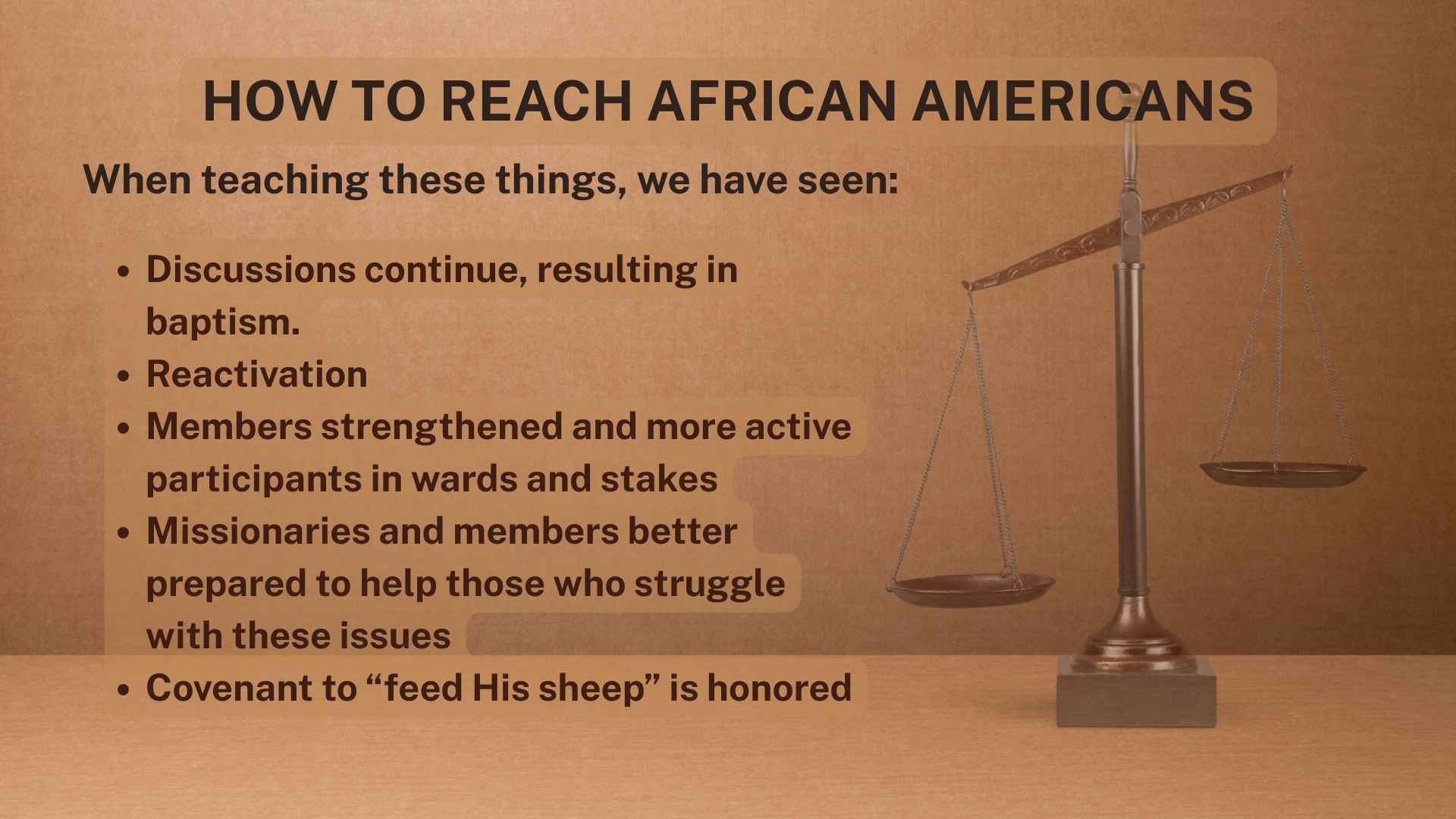 The talk concludes with practical outcomes: improved missionary efforts, increased retention, strengthened members, and greater inclusivity. The speaker testifies that teaching from scripture, combined with honesty and cultural understanding, can help bring more people—especially African-Americans—into and back to the Church.