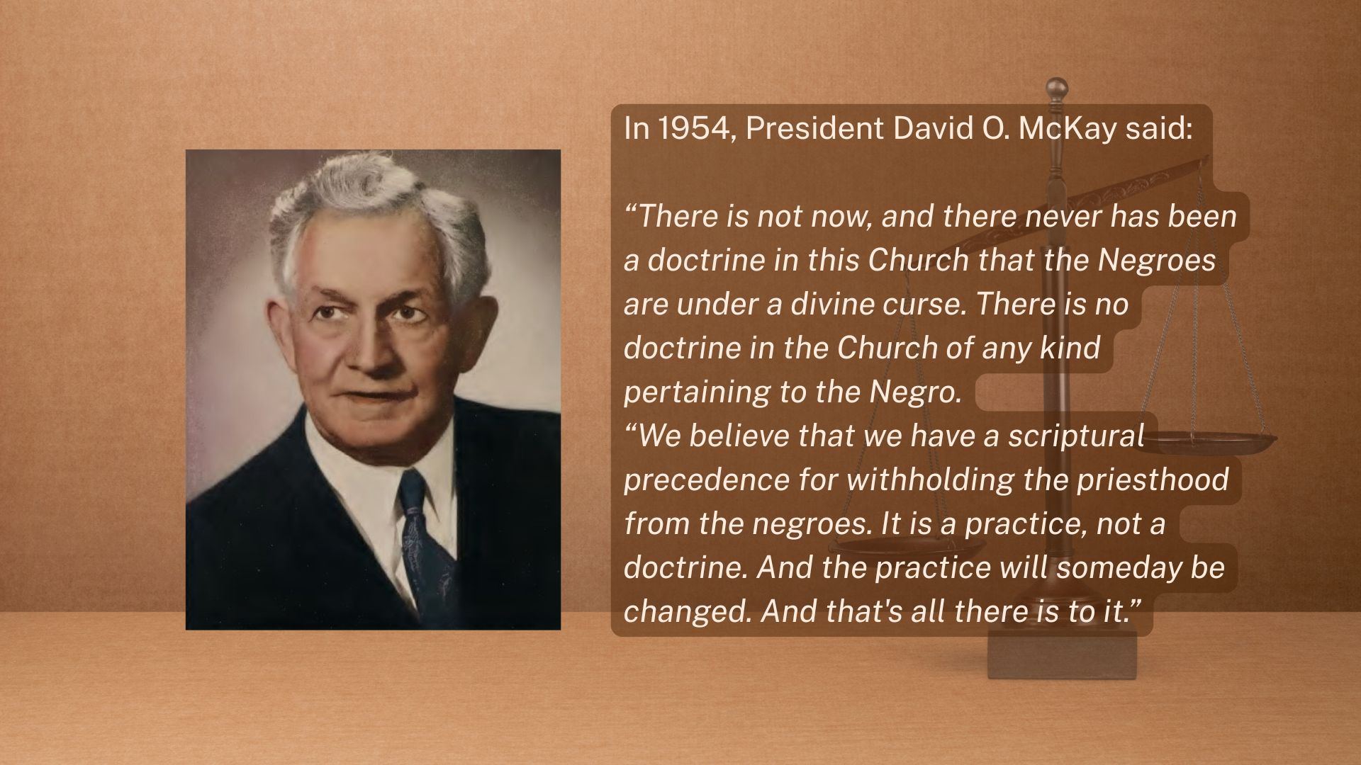 “We believe that we have a scriptural precedence for withholding the priesthood from the negroes. It is a practice, not a doctrine. And the practice will someday be changed. And that’s all there is to it.”