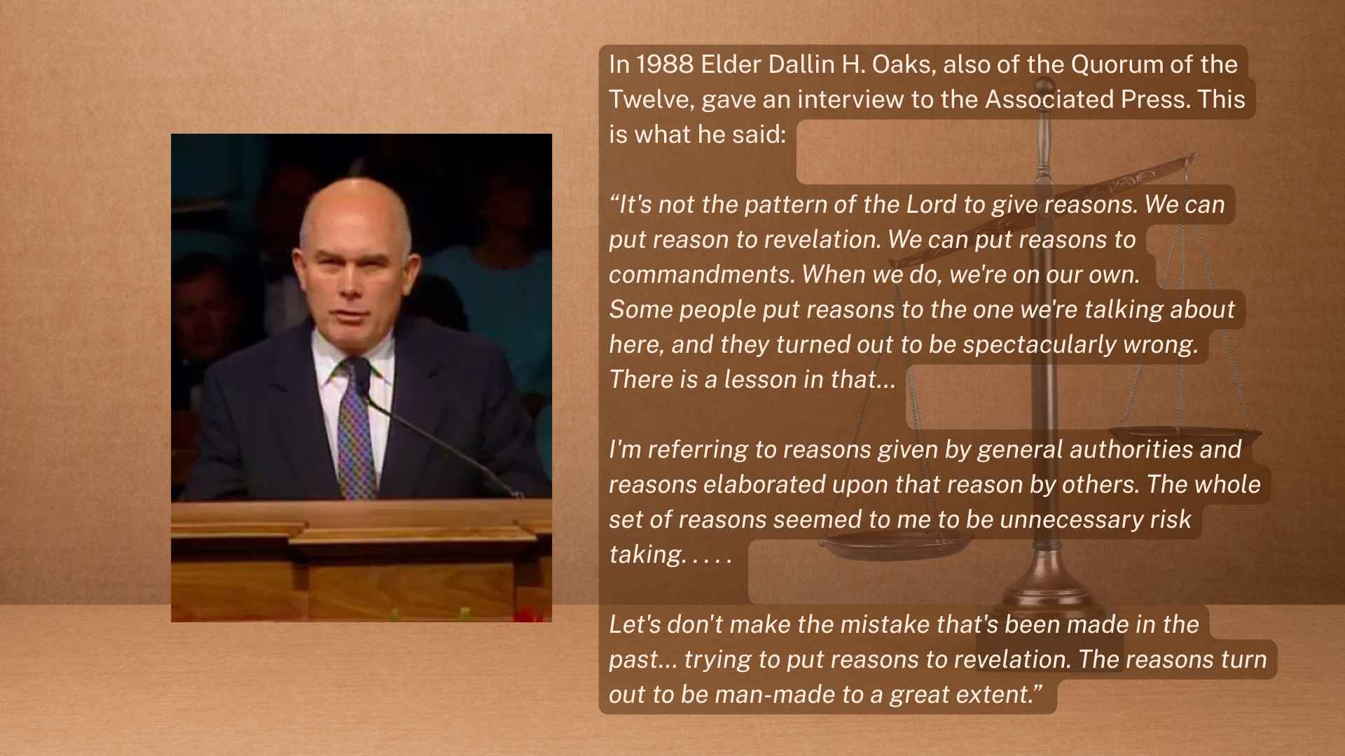 Elder Dallin H. Oaks said in an interview,
