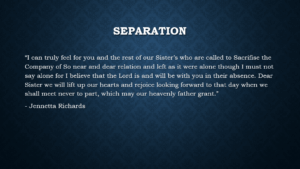 “I can truly feel for you and the rest of our sisters, who are called to sacrifice the company of so near and dear relation, and left as it were alone—though I must not say alone—for I believe that the Lord is and will be with you in their absence.