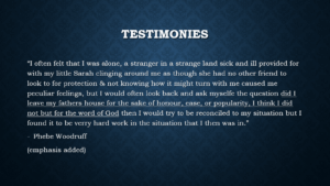 Phoebe Woodruff moved five times during the course of her husband’s mission. She was threatened by two of her male neighbors with having all of her clothes and goods confiscated to pay for her sustenance.