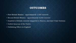 Many of these converts would immigrate to the United States and join the Latter-day Saints in Nauvoo. Or later in Utah. The mission had many other successes, such as unifying the Quorum of the Twelve and the Church’s many publishing ventures started in England. But to my mind, these pale in comparison to the missionary work and the influx of members who would expand and reinvigorate the Church in the 1840s and 1850s.