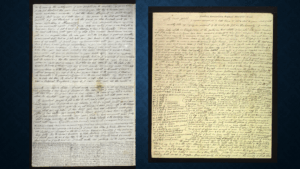 Phoebe and Wilford Woodruff are far more kind of humble. In fact, in one of her letters, Phoebe is writing from her bed—she’s bedridden in the late stages of pregnancy—and she’s very self-conscious of her writing. She says, “Don’t judge me. This is poor paper. I have a poor pen. I’m not spelling things well. I didn’t correct it.” So, kind of very self-conscious of how she’s representing herself to her husband. Who, in his letters, is cramming content in. These are two of Wilford Woodruff’s letter. You can see as he reaches the last inch that he’s just writing smaller and smaller to get everything he has to say in there.