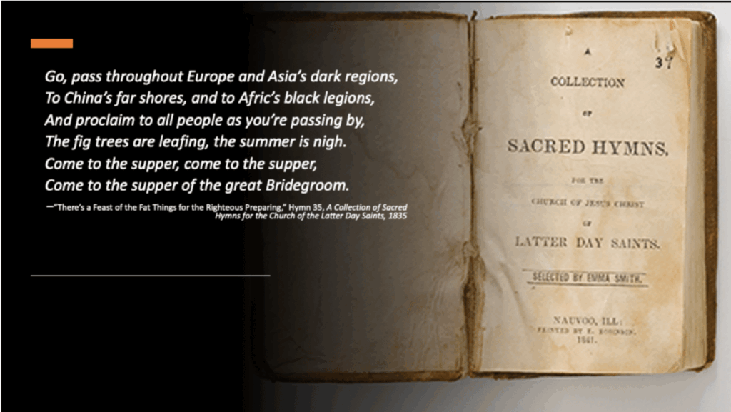 This idea is even found in early hymns. For example, the fourth verse of the hymn “There’s a Feast of the Fat Things the Righteous Preparing,” written by W. W. Phelps and included in Emma Smith’s first Latter-day Saint hymnal, unambiguously calls for Saints to “Go, pass throughout Europe and Asia’s dark regions, To China’s far shore, and to Afric’s black legions.”