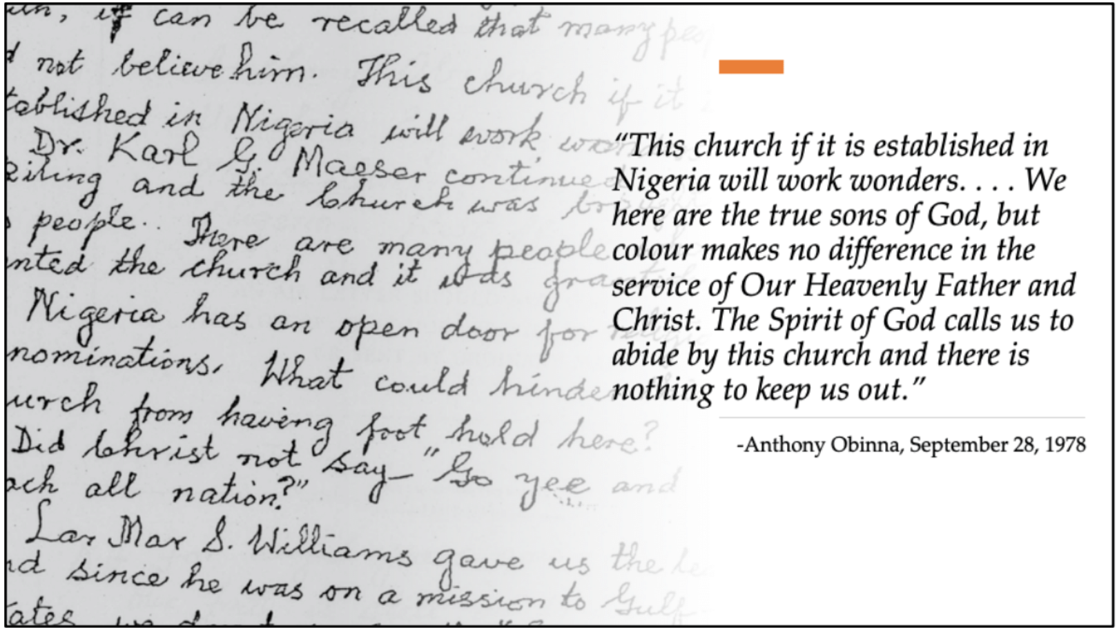 This letter, written in late-September 1978, it is interesting to note that none of the Church leaders who were currently writing to Obinna, despite several letters and visits to the country since June 1978, had not yet informed Obinna of the revelation and the change in policy. In November 1978, when missionaries did come to Nigeria, Anthony Obinna was the first to be baptized. He was ordained the same day and set apart as the first branch president in the country.