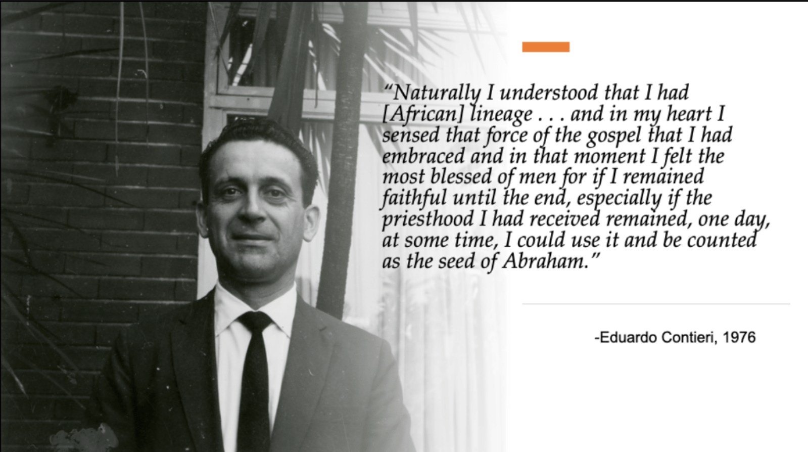 “Naturally I understood that I had [African] lineage . . . and in my heart I sensed that force of the gospel that I had embraced and in that moment I felt the most blessed of men for if I remained faithful until the end, especially if the priesthood I had received remained, one day, at some time, I could use it and be counted as the seed of Abraham,” Contieri said later.