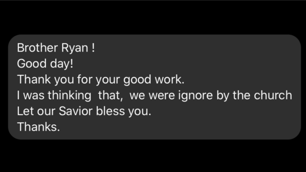 When I opened the app, this is what I found. “Brother Ryan! Good day! Thank you for your good work,” he wrote. “I was thinking that, we were ignore[d] by the church. Let our Savior bless you. Thanks.” I was struck by this message. Here was a faithful member of the Church, one of the first members and an early priesthood leader in his country, who even spent time working for the Church, and he still felt ignored.