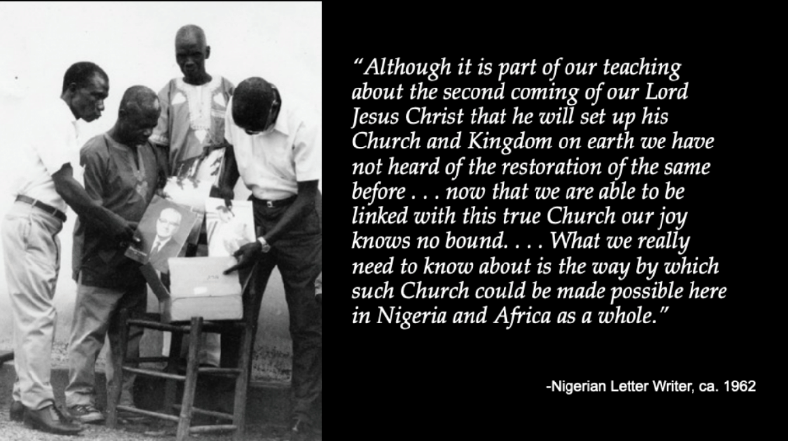 It is clear from the records of Church leaders during the 1960s and 1970s, that their encounters with Black Saints, primarily but not exclusively in countries outside the United States, prompted much of their reflection on race issues. By reading and sharing the stories of Black Saints from around the world, we are all better able to find the peace and assurance that Elder Sitati spoke of and to look to the future of the Church fully inclusive of ”every nation, kindred, tongue, and people.”