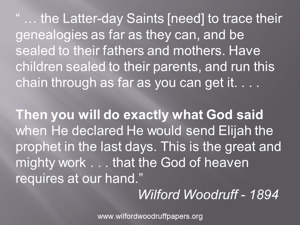 He reiterated, almost word for word, what Joseph Smith had explained in March of 1844, that the saints needed to trace their genealogies as far as they could. And that meant information on those that had died, those that had perhaps even disowned family members for joining the church or been unfaithful during their lifetimes. Because he said, “it is only if we do this, to run this chain as far as we can, that then we will do exactly what God intended when he declared he would send Elijah in the last days.”