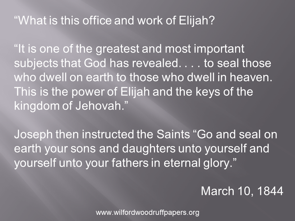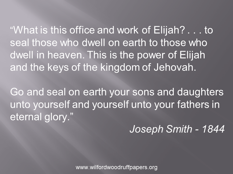 Three months before Joseph Smith was killed, when he was asked the question, “What is the office and mission of Elijah,” he said, “It is one of the greatest important, most important subjects that God has revealed, to seal those who dwell on earth to those who dwell in heaven.” And he said, “This is the power of Elijah, we understand the keys of the kingdom of heaven are the sealing keys.” But his instruction to the saints was to go and seal themselves and their sons and daughters to their fathers and eternal glory. Joseph Smith did not administer that ordinance in his lifetime.