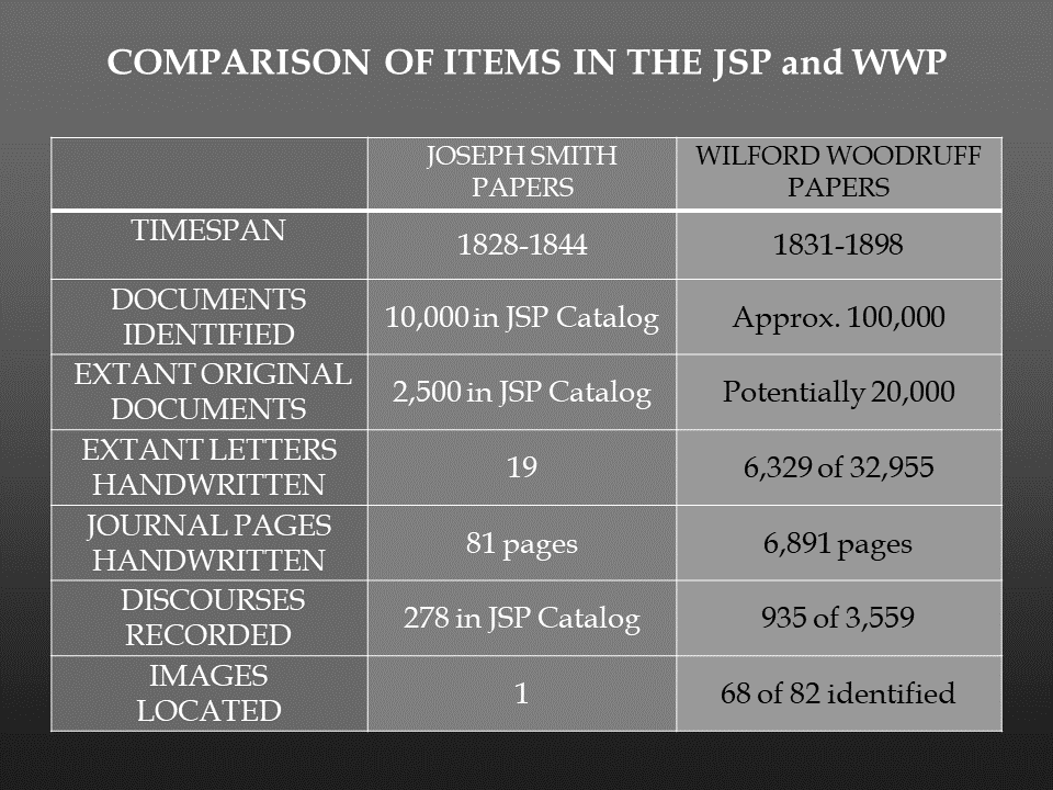 This slide is because the first question I usually get is, how do you compare apples to apples with the Joseph Smith papers in the Wilford Woodruff papers? When we met with the church history department to get their support, their access to records, their understanding of what we were doing, and what and to gain their knowledge of what they had done, they basically said, “Do you have any idea what you’re getting yourself into?” And the answer is, yes, the exponential difference in the number of documents between the Joseph Smith papers and the Wilford Woodruff papers is something we do understand, because he wrote everything down.