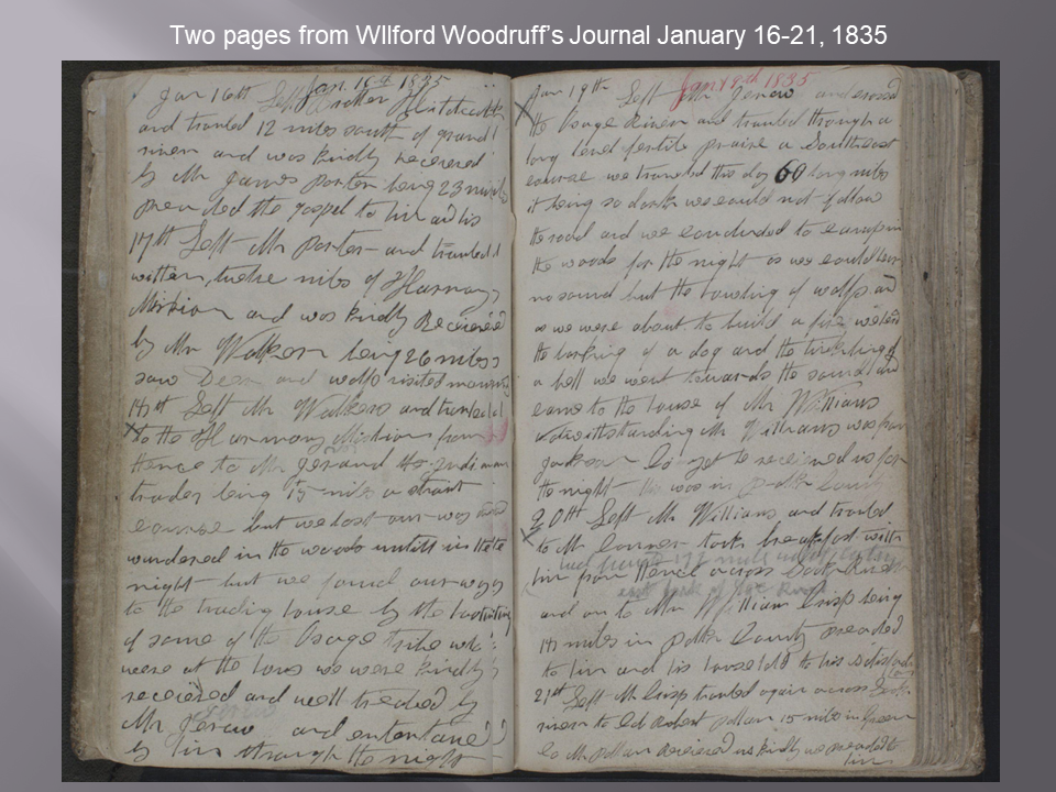 To begin with, I would like to explain the title of my presentation: Discovering Church History. I think there’s a couple of meanings to that word. And in this setting, I think the first is our own seeking and our own study, to discover church history and what we as a collective group offer to others who are seeking truth. I also believe that the Wilford Woodruff Papers is a great asset to that body of scholarship and will provide more information and more documents and the ability to study more church history to add to the great group that we already have. And the third is what Wilford Woodruff offers himself. It’s not just the words that he’s recorded, but his example of living according to the truth that he knew, and doing so completely, and from the very first day that he heard about the church in 1833.