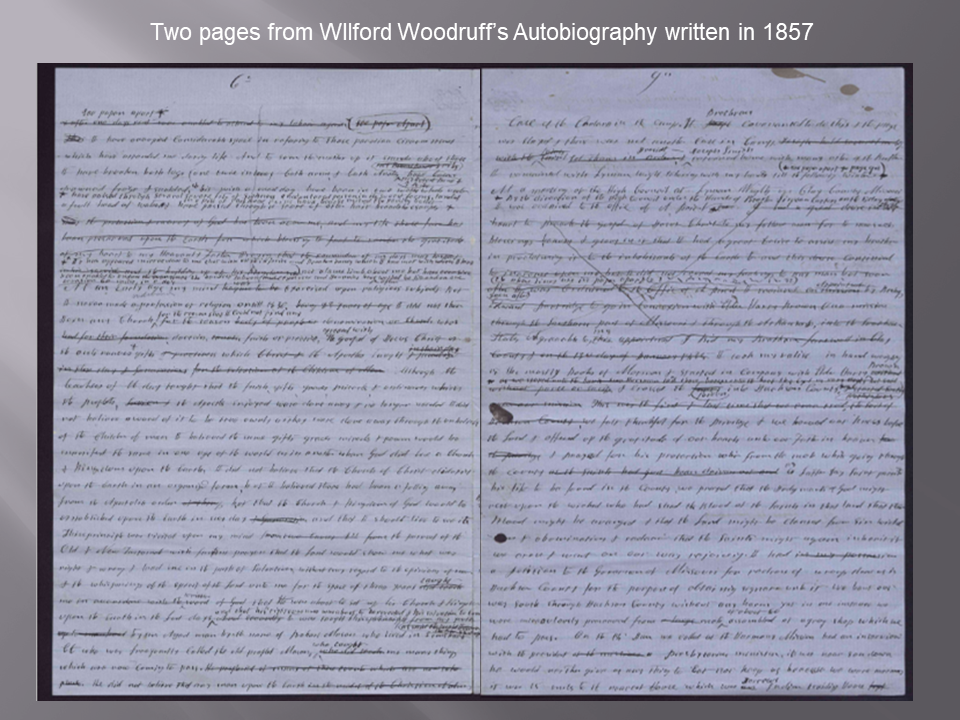 So, to give you a quick idea of how we’re approaching this, these are several of the documents, samples that we’re working with. This is two pages of a four-page letter that Wilford Woodruff wrote, some of this is impossible to read. We call it “Wilfordish” because it’s not really English. His spelling is so creative, that there’s no way that any computer could follow it. Also, there’s no way to decipher it. We have people that have offered to use AI or something like that but it’s truly – he includes Deseret alphabet, Pitman shorthand, Taylor shorthand, and his own version of all those. So, it’s an adventure.
