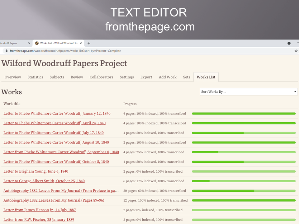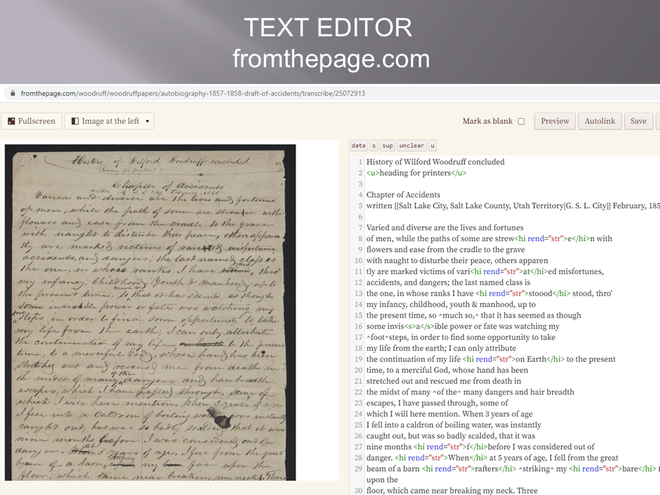 So, the text editor we’re using is from the page. It’s an open access editing site, and there are hundreds of papers, projects and other projects. Even the Library of Congress is doing crowdsourcing transcription of documents, which is what we’re using as well, so if any of you have an hour or two or even 10 minutes, you can get a free account, sign up and read a Wilford Woodruff document to be the first one to ever do it. And we’d be thrilled for your participation. The coding is the HTML. And those kinds of things are, are built into the system. So, it helps very much. We have volunteers from the age of 15, to the age of 86, right now. And they’re incredible.