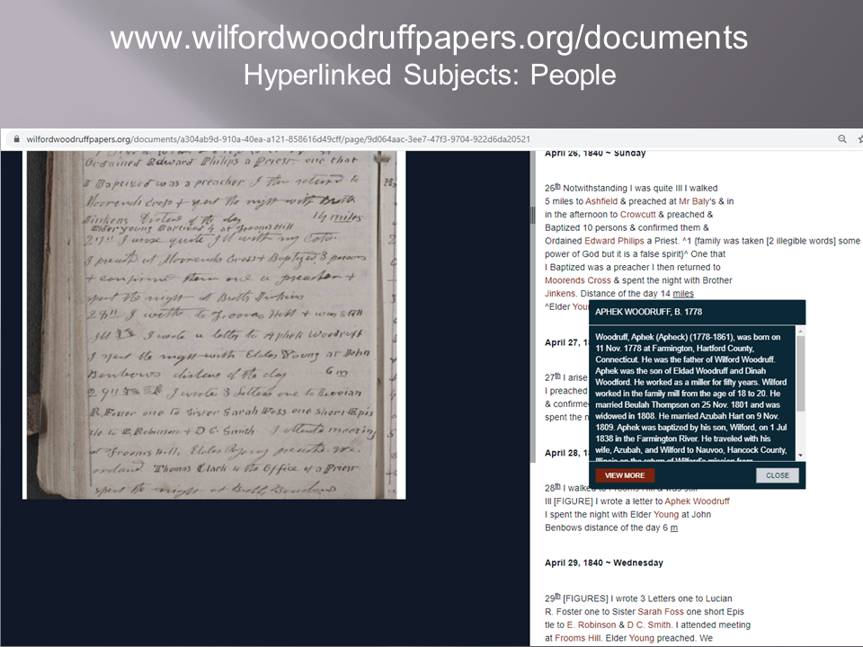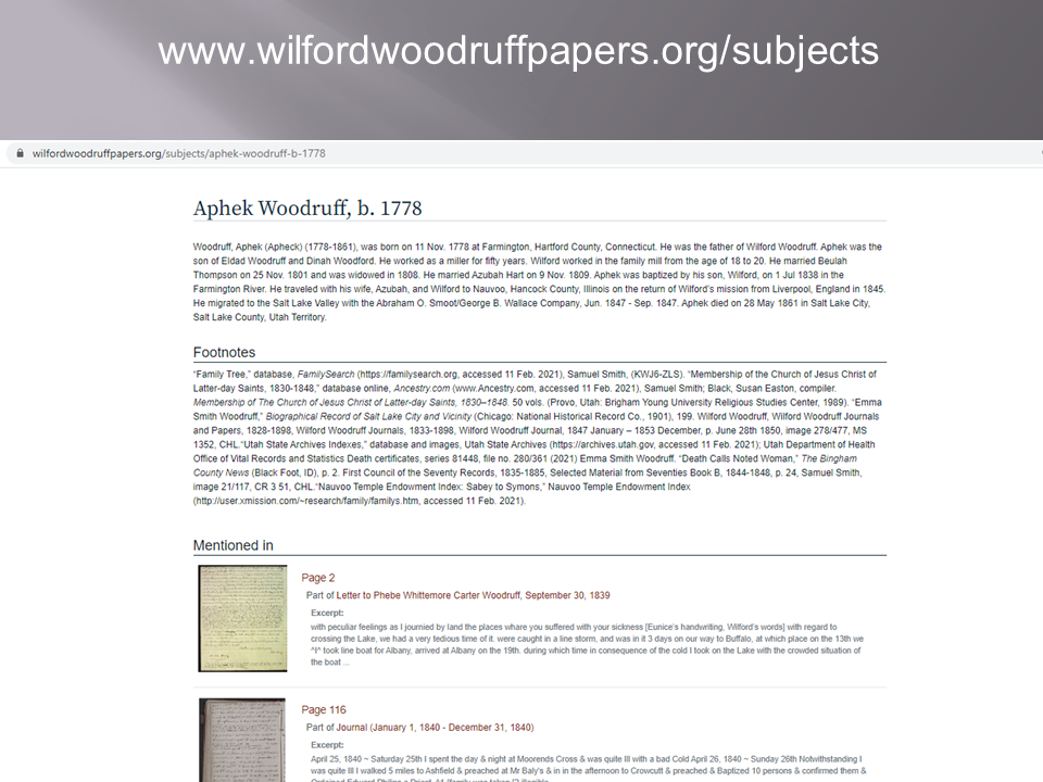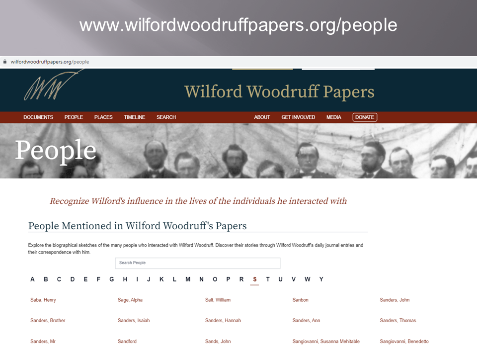 On the website, again, it’s not just the documents, it’s the context for those documents, understanding the people he interacted with, their stories, their lives, their relationship with church. The last speaker spoke of Joseph Smith’s candidacy for the President of the United States and his running mate could have been Solomon Copeland. Wilford Woodruff, taught him, healed his wife, baptized his wife and two other people on there in their household and wrote a letter asking him if he would be the vice-presidential candidate; you can find that information on the website.