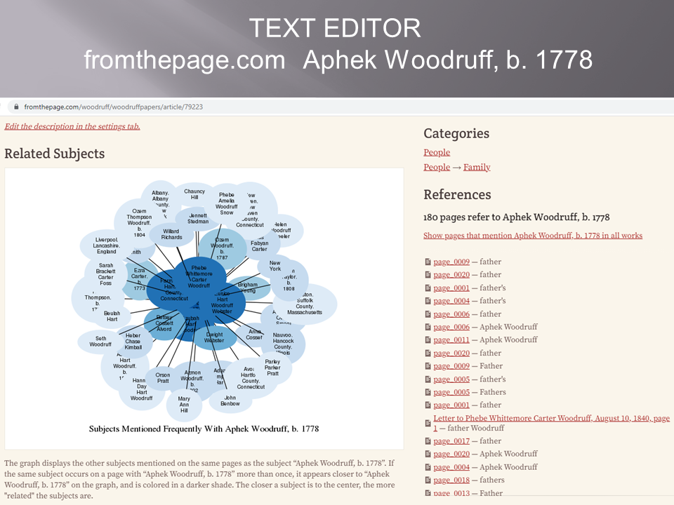The text editor produces these connections, and whether he’s referred to as “my father” or “Aphek”, or “Father Woodruff” it will go to the same person and connect him in any way that he’s referenced in the documents.