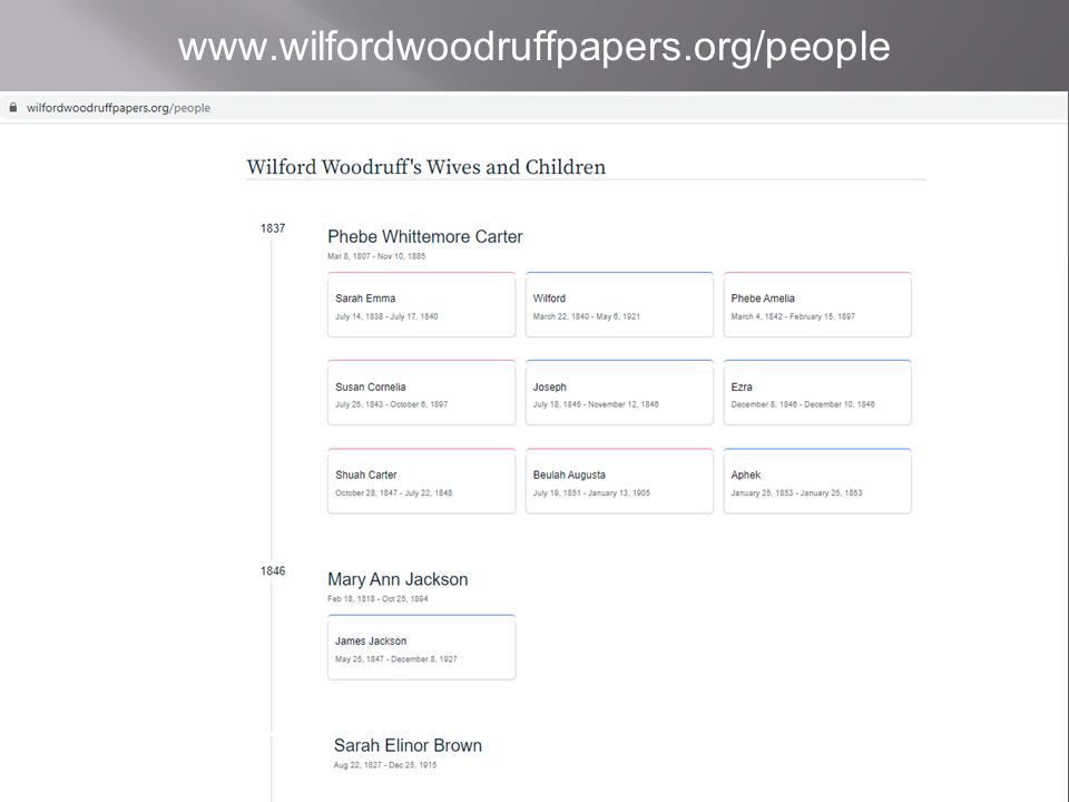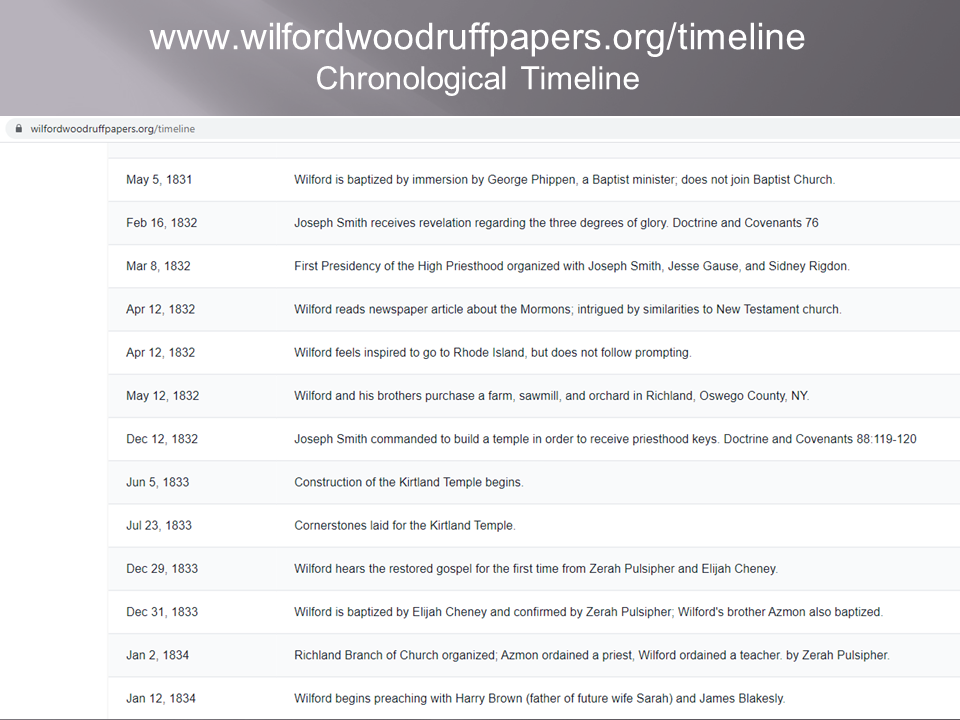 The other thing is a visual and interactive timeline. So, when I was doing my research, I had to keep a notebook. Like when you read War and Peace, you have to write down all the different characters and try to keep them all straight. So, the timeline became Wilford Woodruff’s life in the context of church and US history.