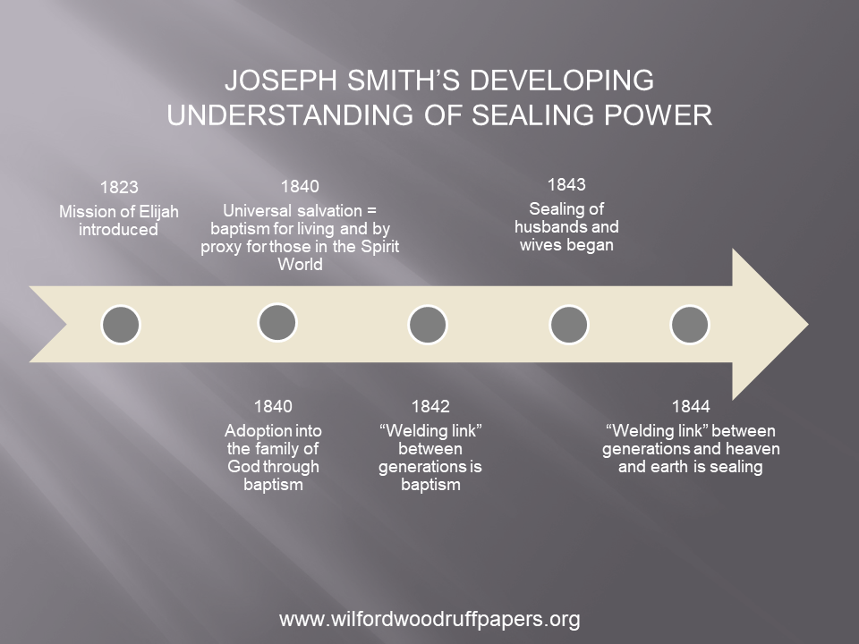 To briefly go through what it took me 450 pages to explain in my book, the understanding of sealing power developed over Joseph Smith’s lifetime; it took him 21 years to finally explain the mission of Elijah. And it began with the understanding that baptism was adoption into the house of Israel in the kingdom of God. And then as that understanding progressed, it wasn’t sealing just of ordinances or covenants, but finally sealing of individuals to each other, that there could be a welding link beyond death.