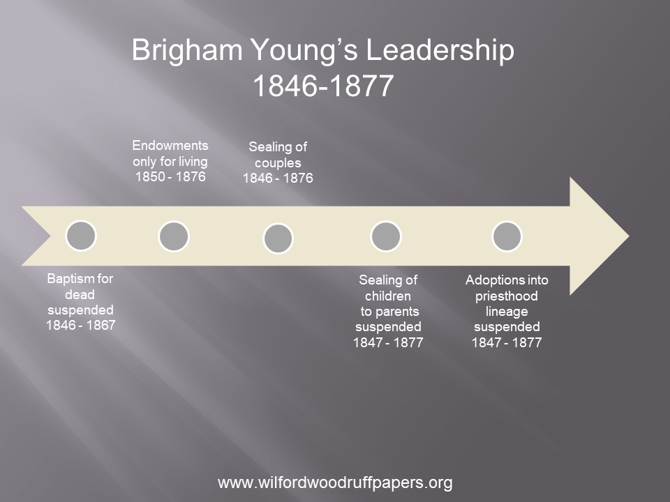 So as Joseph Smith, Brigham Young only lived for months after these ordinances started in the St. George temple, and he was unable to complete what Joseph Smith had explained as the mission of Elijah. And during this period, it was Wilford Woodruff, who presided over first the St. George temple, and then those trained in the St. George temple, trained those in the Logan and Manti, and then Salt Lake temples. But Wilford Woodruff presided over again, the ordinances that were adapted to new temple structures, the ordinances that were refined, the first written ceremonies, and the discontinuing of ordinances including rebaptism, and adoption. And it was 50 years after Joseph Smith’s death – 50 years and one month after Joseph Smith explained what the office and mission of Elijah was about.