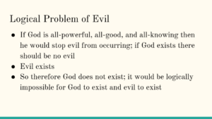 The logical version of the problem of evil states that there is a logical contradiction between evil and God’s existence. If one exists, then the other cannot exist. J.L. Mackie best articulates the logical version in his famous paper Evil and Omnipotence: